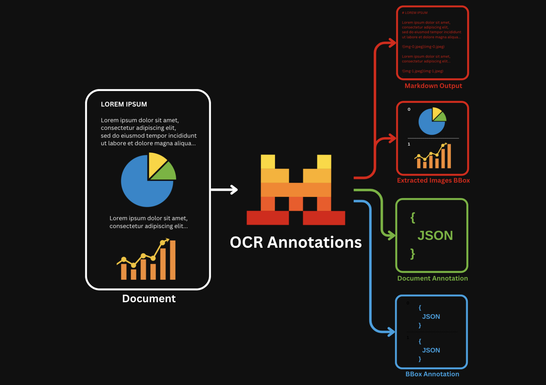 - We run OCR and send the output text in Markdown, along with the first eight extracted image bounding boxes, to a vision-capable LMM, together with the provided annotation format.